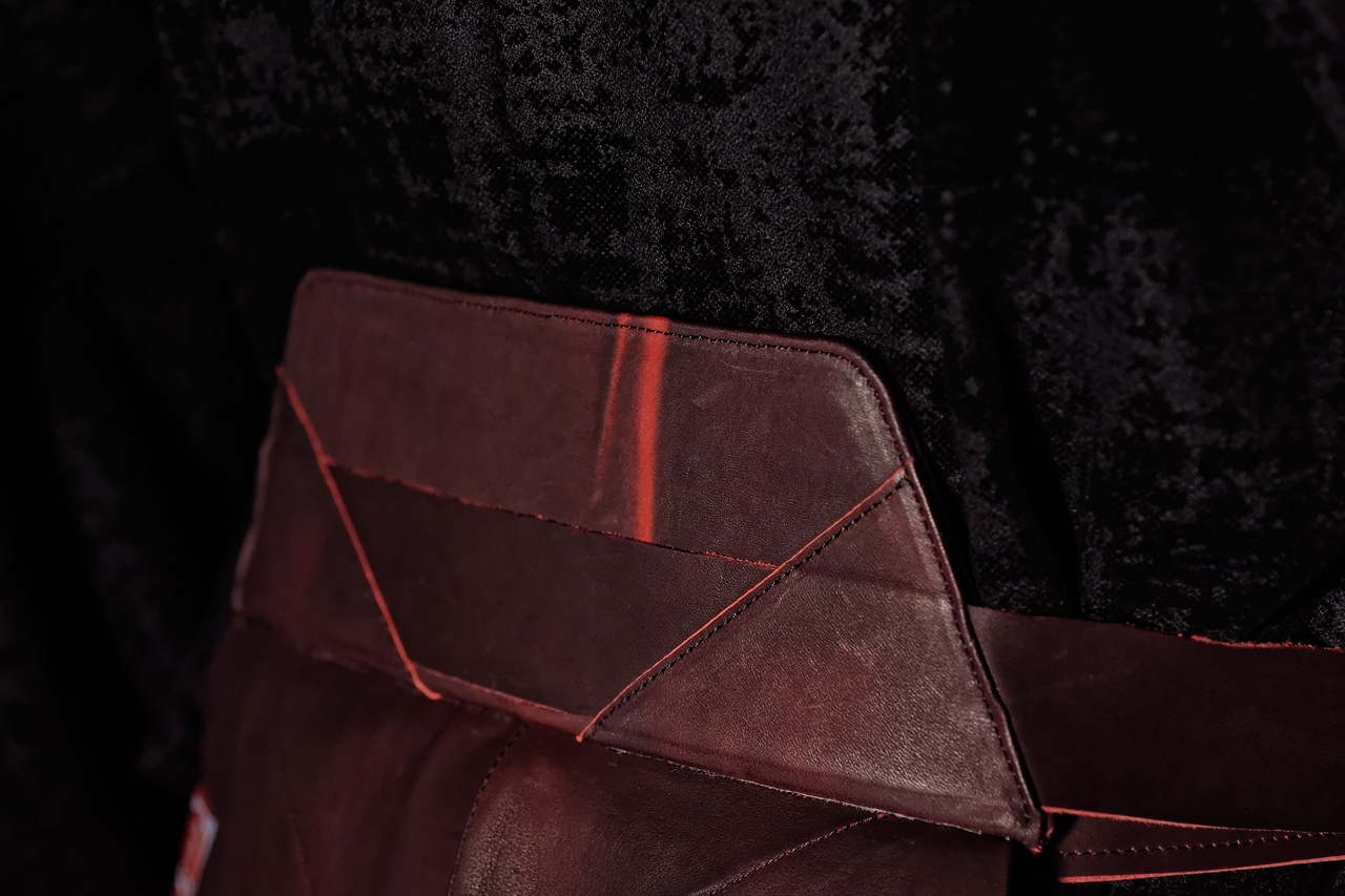 さて、1作目のコーディネートの詳細に入るとしよう。この袴は、色出しに特に苦労した。タンナーのM氏に複数回染めてもらい、この黒に赤いムラが映える妖しげな色に完成した。注目すべきは腰板部分で、はっきりとした赤い染めムラを、わざと一番に目を引く腰板に模様として配置し、袴全体のアクセントとした。腰板は最も細かい仕事を要する部分で、職人の丁寧な技が詰まっている。また、後ろの紐は野趣あふれる厚めの革の1枚仕立てにした。これは裏革の鮮やかな赤を利用し、紐を結ぶことや捻ることで赤を見せて着こなしの遊びを楽しむためである。言うまでもなく、全体に浮かぶ赤いムラや断ち切りの裾、うねるヒダも底知れぬ迫力を醸し出してくれる逸品に仕上がった。
