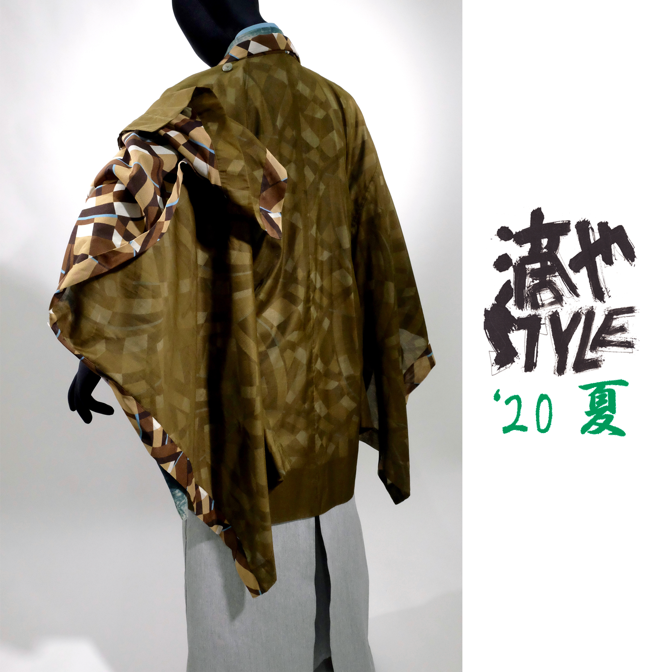 絹混紡のカーキ色・シースルー素材に、ブラウン系のレトロモダンな幾何柄のベールを重ねた和慈羽袖。