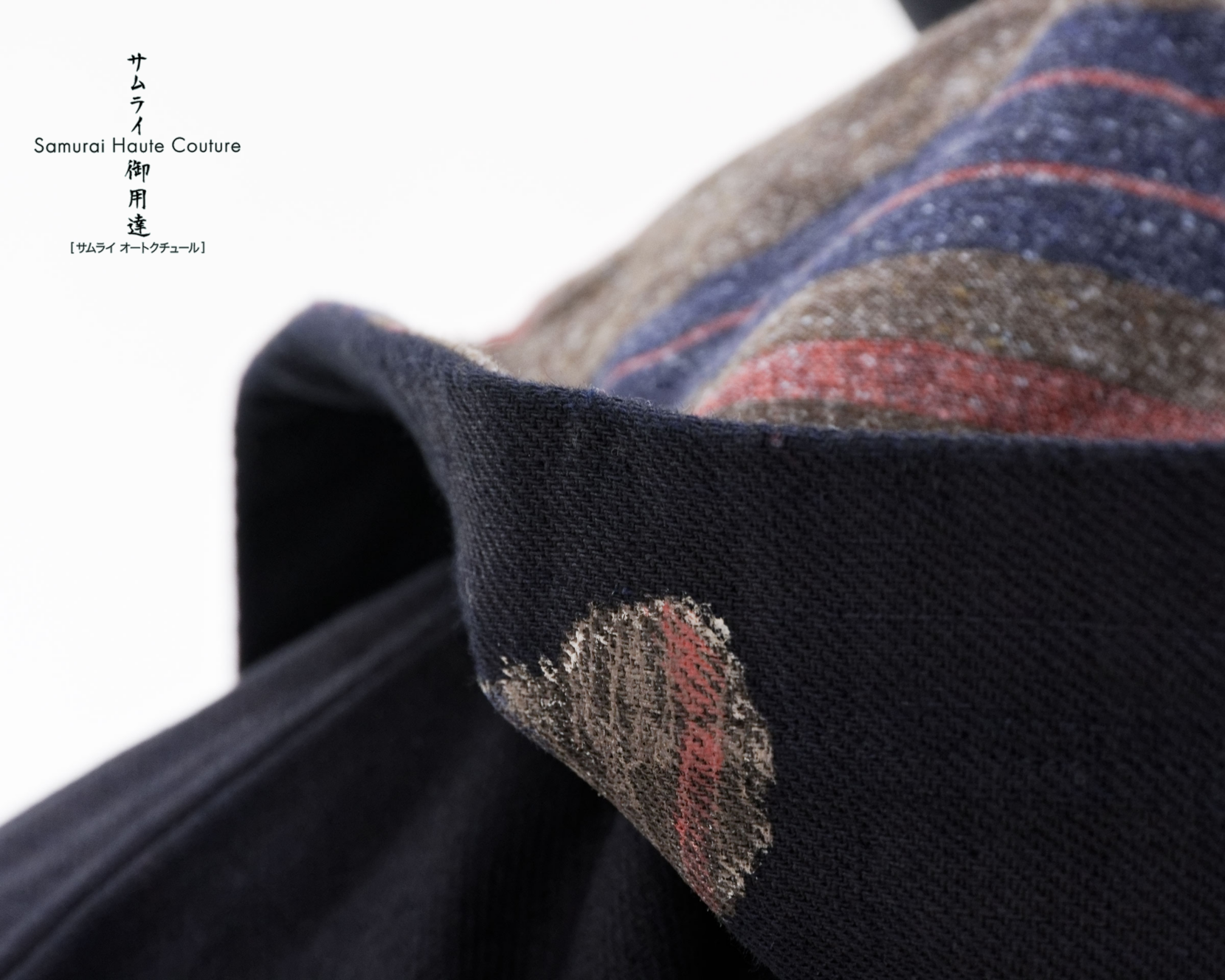 インディゴ染めの表が破れて 内側のボーダーが覗くように見える部分は 手描き捺染による騙し絵で、BORO(ぼろ)の世界観を捺染で表現した風土ローブ。