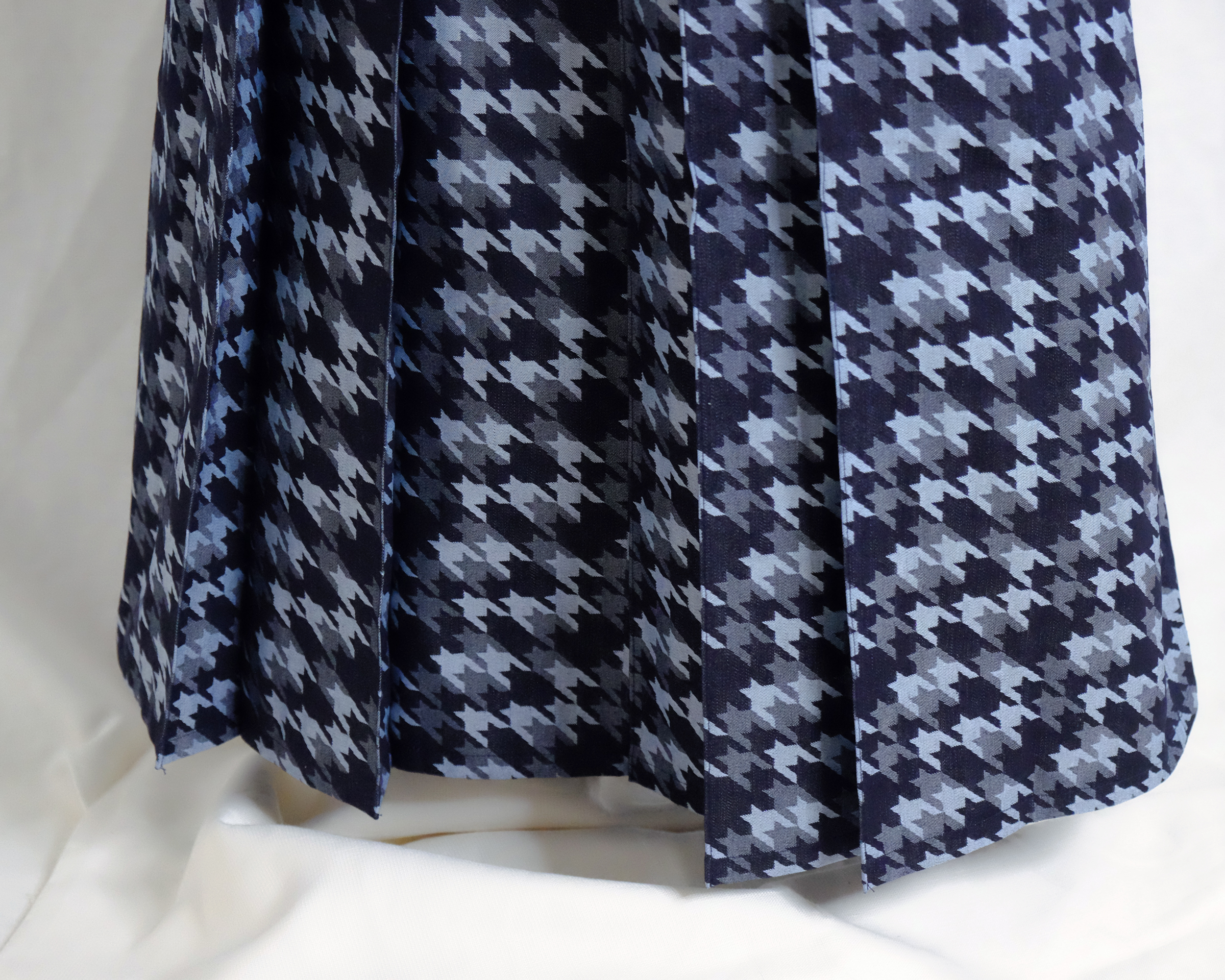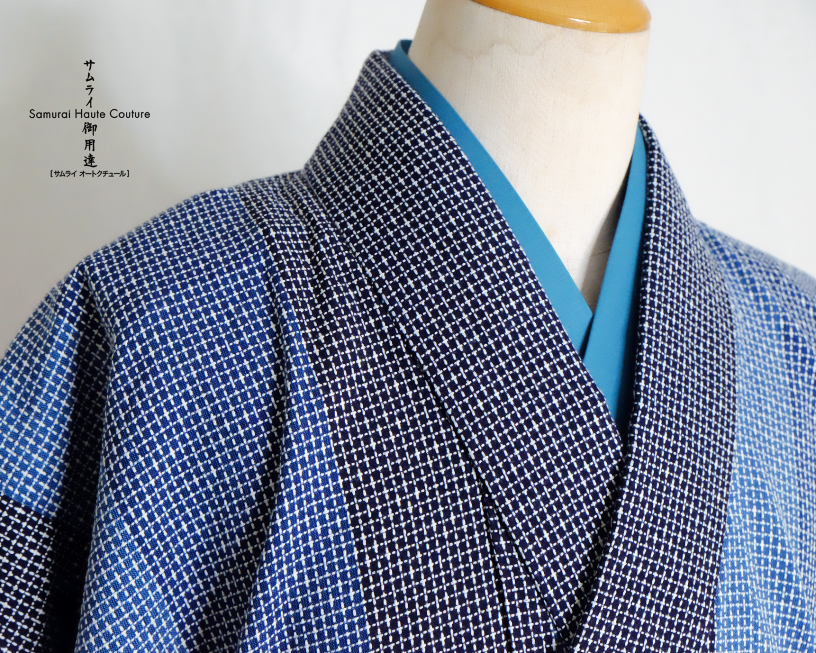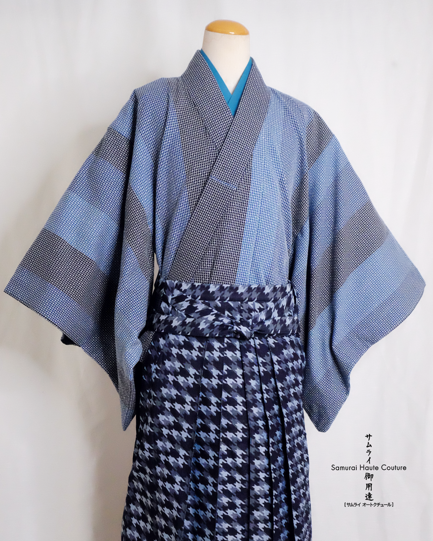 カツオ縞に刺し子を施した木綿の小袖と、グラデーションの千鳥格子を紋織したデニムの袴との、いなせなコーディネート。インディゴ染めによる経年変化も楽しみ。