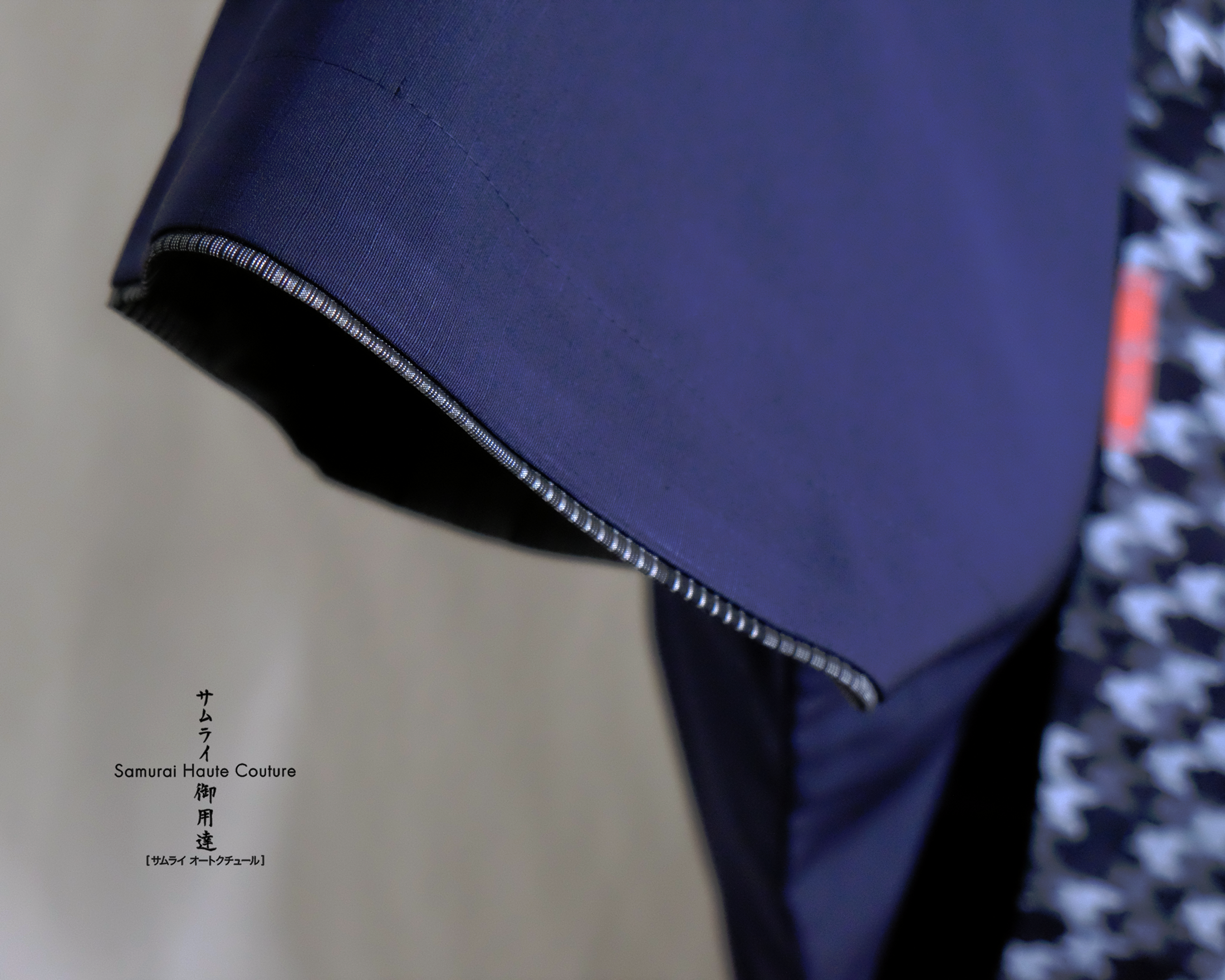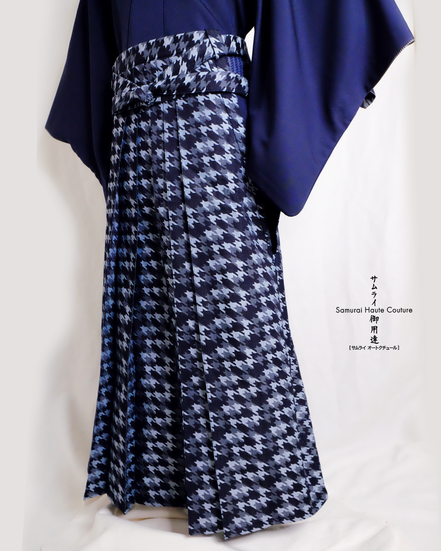 This item has a refined look with the grosgrain navy blue Kosode and the denim Hakama with Jacquard weave gradation houndstooth. Hakama is indigo dyed.