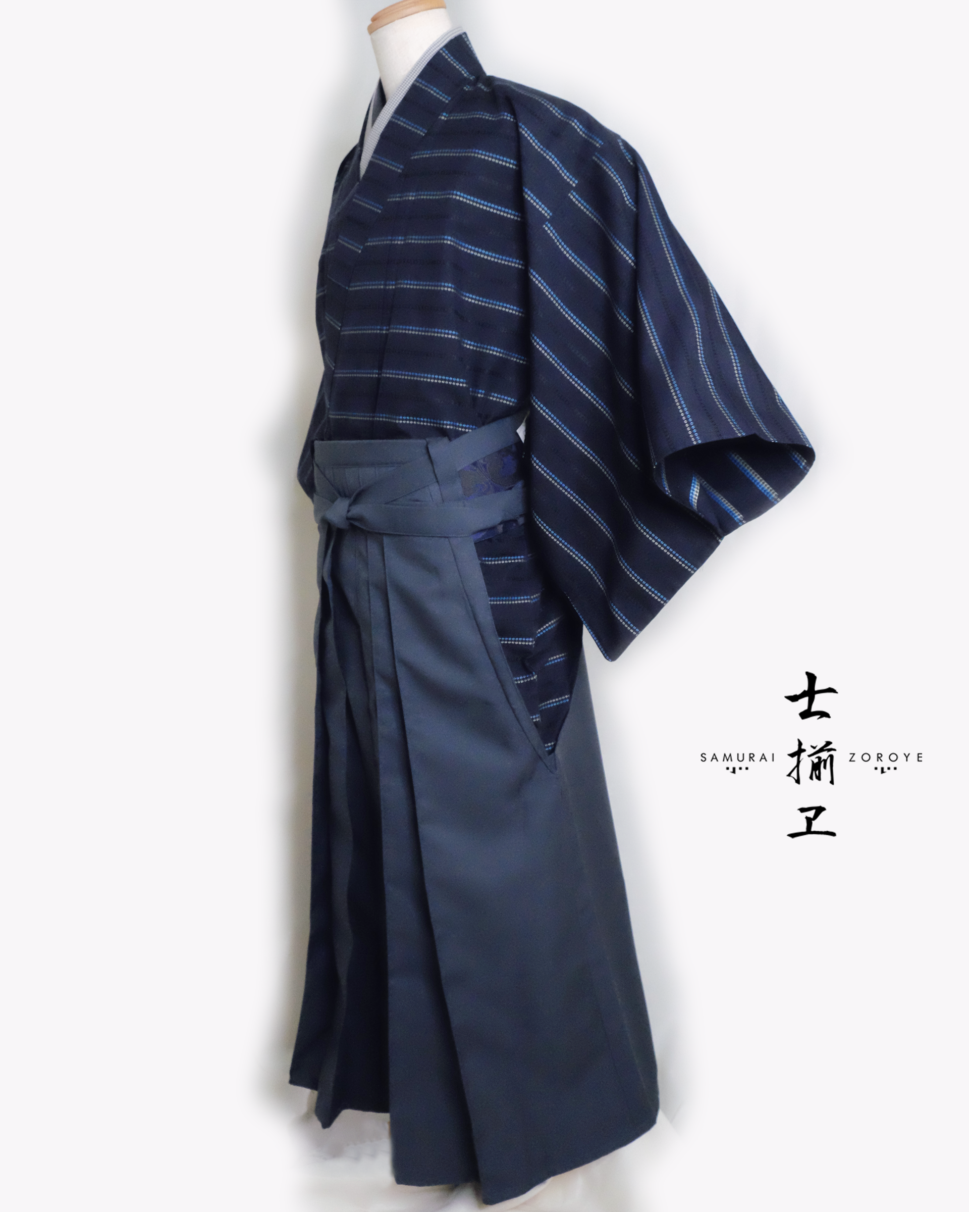 濃紺の紋織ボーダー胴着と グレーのツイル袴との、凛々しいコーディネート。上下ともに シワが付きにくい素材で、きちんと感があり 清々しい印象。