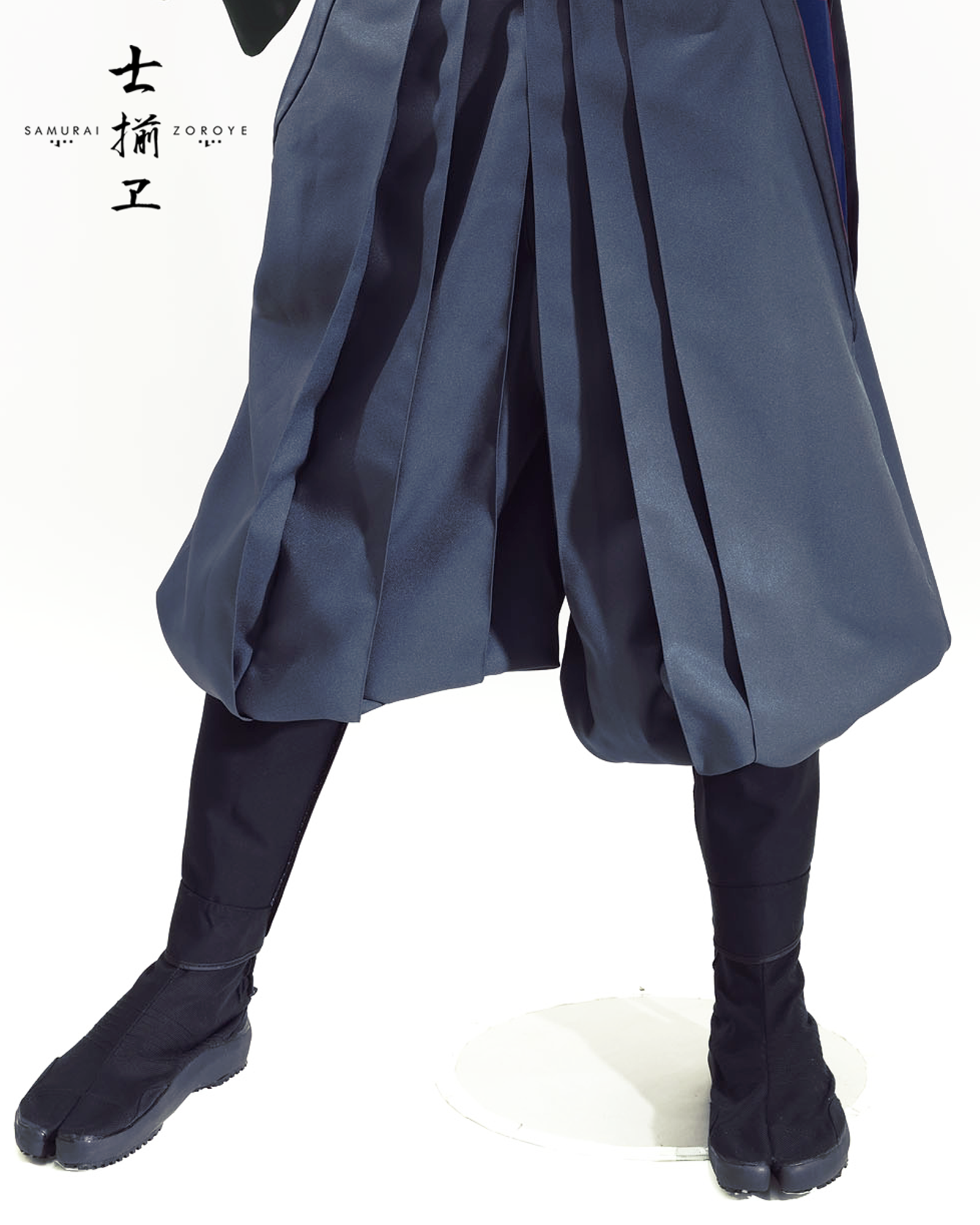 そして、胴着との精悍な組み合わせのグレーの袴は、シワが寄りにくくて、柔軟性があるツイル。袴向きに 若干肉厚に織ってあり、こちらも ウォッシャブルでイージーケア。洗練された艶と軽さに加え、ハリがあり 発色の良い上質なポリエステル。裾を絞り括る追加機能の「出立括り」では、ヒダが より際立ち 力強さが加わる。シワになりにくくて、便利です。