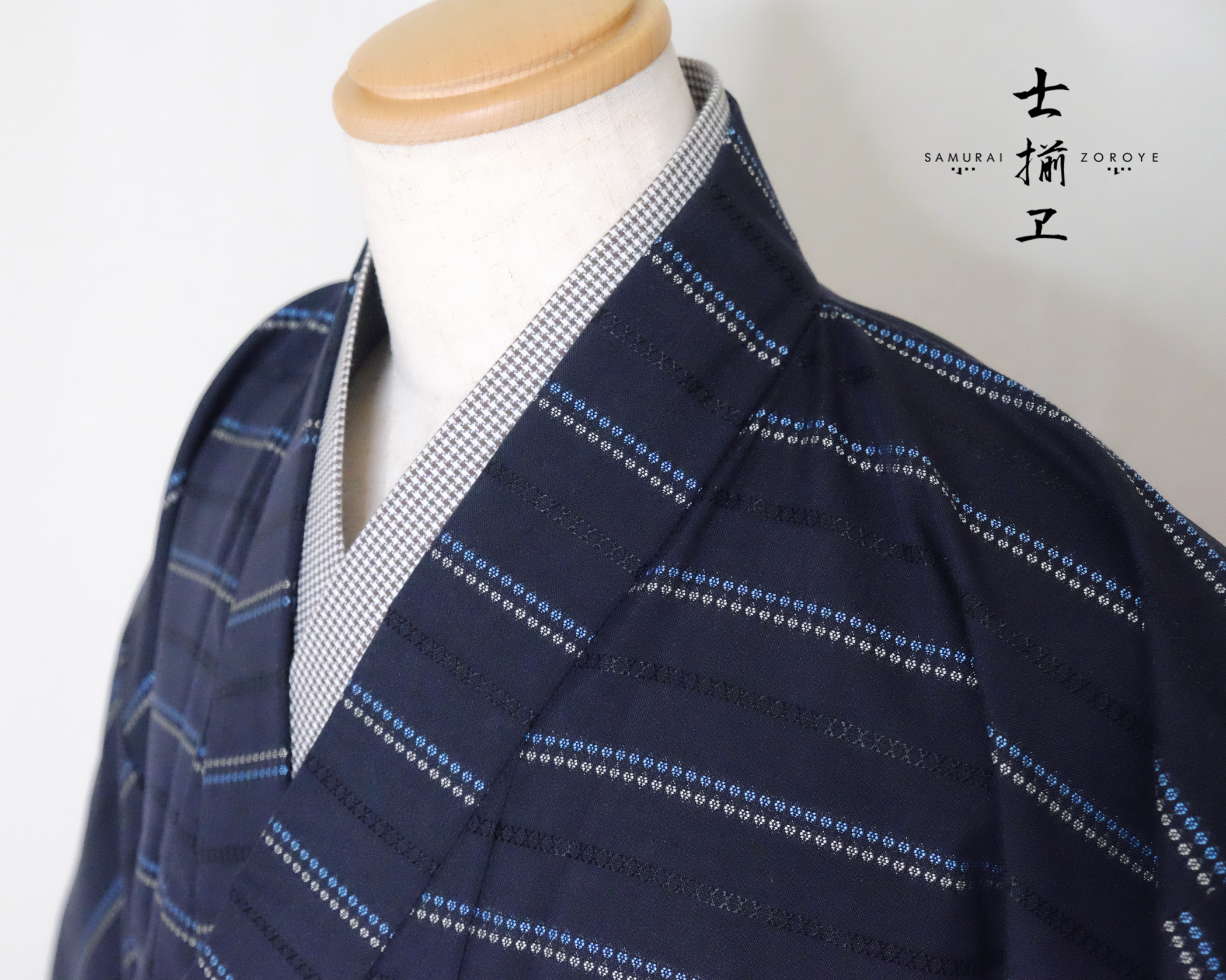 胴着は、濃紺地に白とブルーの細かいドットを並べたボーダーや 黒のボーダーが走っていて、緻密な柄ゆき。 防シワ効果の高い素材で、着心地よく適度な厚みがあります。紋織りによるボーダーなので、整った印象に スマートさが漂うスグレモノです。